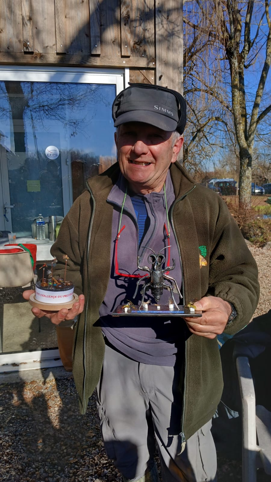 Ce samedi 8 novembre, nous voilà repartis pour 1h30 de route dans le but de pêcher le lac des Grands Champs, au nord de Guéret. Ce lac est une ancienne carrière de minerai d’uranium, arrêtée, rebouchée et mise en eau. Une eau très claire, facilitant la pêche à vue, un empoissonnement très intéressant avec quelques 7 ou 8 variétés de salmonidés de très belle taille, qui naviguent en bordure tels des sous-marins atomiques ! (avec l’uranium ça tombait bien !). Un prix de journée abordable, des gardiens sympas, un club house chauffé pour manger, un environnement champêtre, et à part la proximité de l’autoroute tout était fait pour une belle journée de pêche, pluvieuse cependant. Le fait de voir les poissons est très excitant mais n’est pas gage de réussite, loin s’en faut. Il a fallu s’employer pour piquer les truites et changer souvent de technique (le streamer a bien fonctionné, les nymphes, les Worms et les montanas ont été les meilleures mouches.). Personnellement j’ai eu le bonheur de piquer 2 gros poissons en sèche sur scarabée, dans les rides lors d’un coup de vent frais. Tout le monde a tiré son épingle du jeu avec entre 5 et 10 prises, des casses et décroches. Seul Thierry a un peu surpassé tout le monde avec 15 réalisations, mais au regard des parties de belote la veille il n’y a rien d’étonnant ! Je dis ça, je ne dis rien ! Le retour tardif au gîte nous a permis de prendre notre temps pour l’apéro et la cuisson des 3 bocaux de cèpes portés par Thierry (tout lui sera pardonné) accompagnés de pièces de bœuf juste tournées et retournées ! Un régal ! Les oreillettes d’Antoine, la salade de fruits dont les boîtes nous accompagnaient depuis 15 ans ont été ouvertes prestement, la tarte aux pommes de Gigi et la fouace de Patou, ont complété le menu, tout cela pris devant un écran de télé pour France Afrique du Sud. Verveine de Richard, tord boyaux de Philippe ont eu finalement raison de notre estomac et c’est avec Mme doliprane que nous avons passé la nuit !